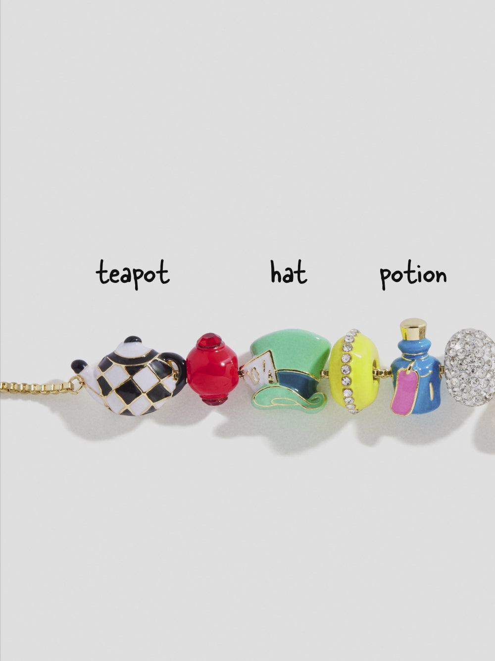 Fall down the rabbit hole and take your wrist stack to Wonderland. This bold twist on the classic charm bracelet brings together the most curious characters of all.