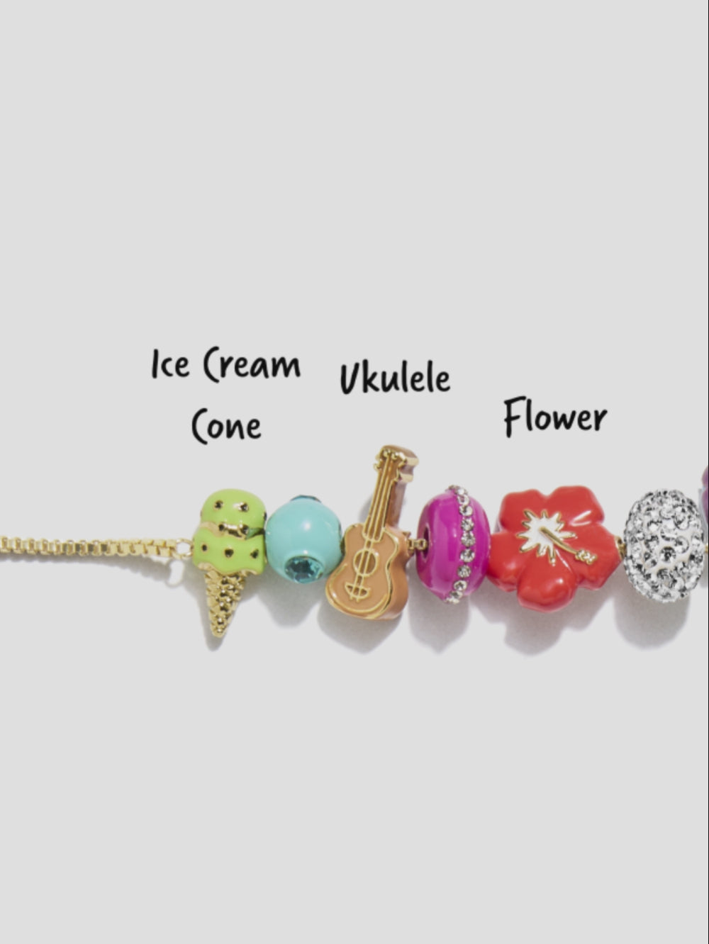 - Strung alongside a mix of multicolored beads, glossy gold accents, and pavé details