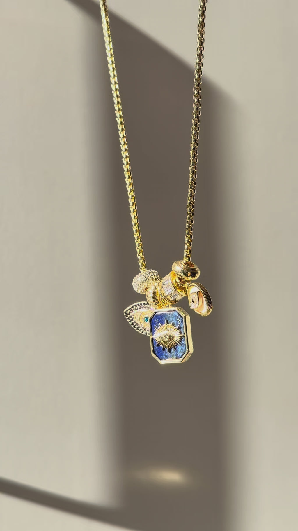 - Three hanging charms and four rondelle bead charms are strung on a delicate ball chain.