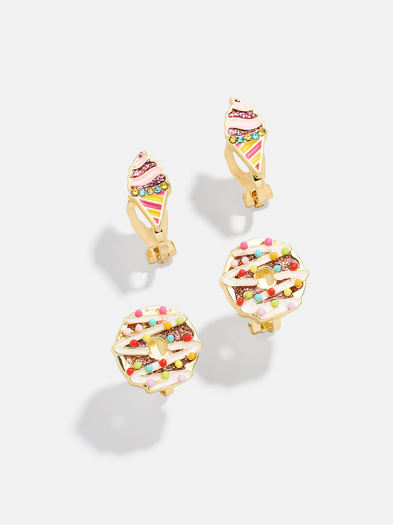 Satisfy your little one's cravings with the Sweet Tooth Kids' Clip-On Earring Set. This set includes a pair of colorful donut and ice cream clip-ons that are lightweight and easy to wear. So cute and playful, they are the perfect way to show off your love for all things yummy.