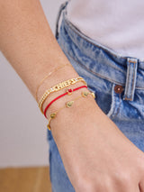 - Includes one tennis style, a corded bracelet with color-coordinating gemstone, and a gold pisa bead with repeating logos