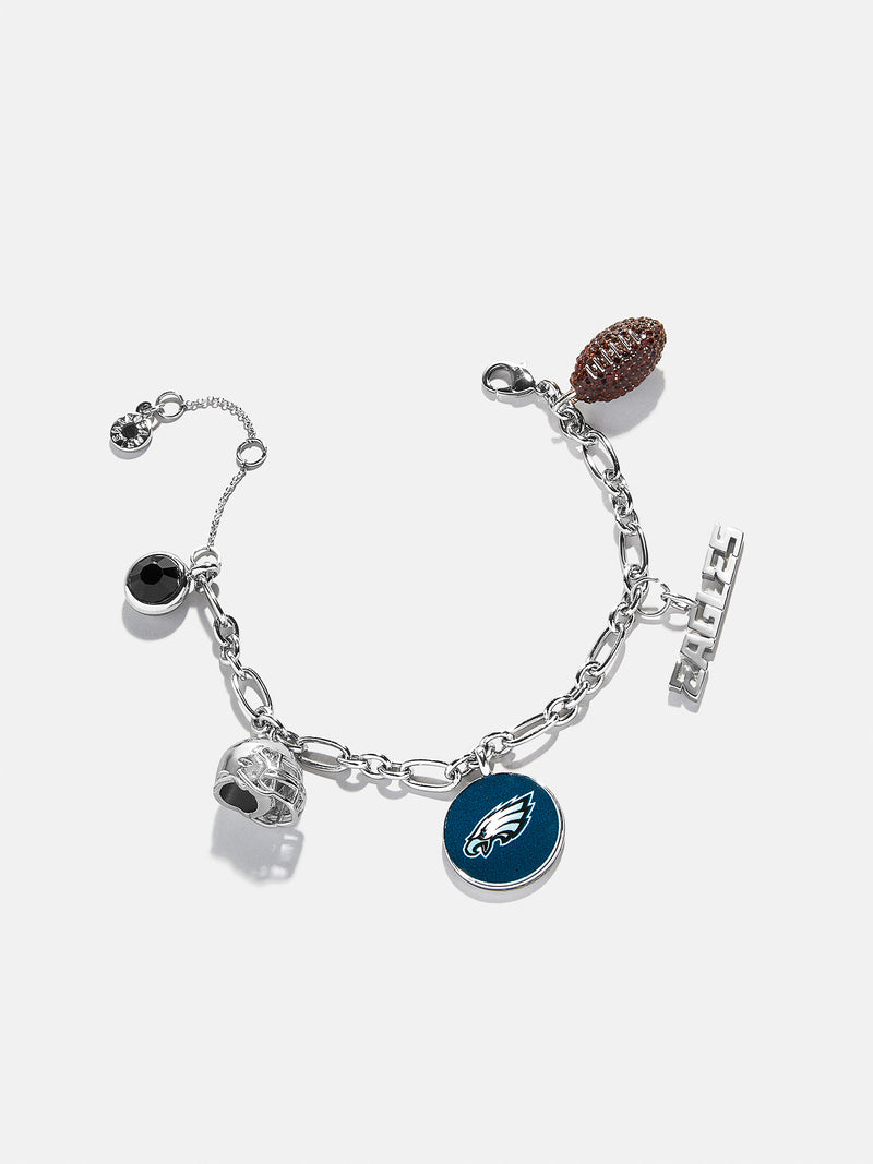 - Charms include a glossy gold helmet, crystal detail, team logo, team nameplate, and a pavé football